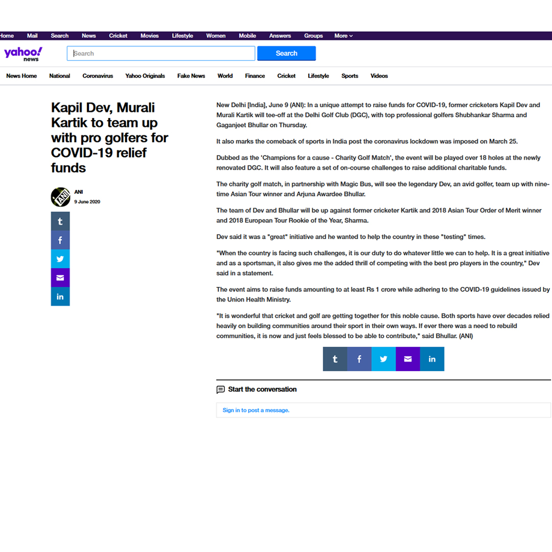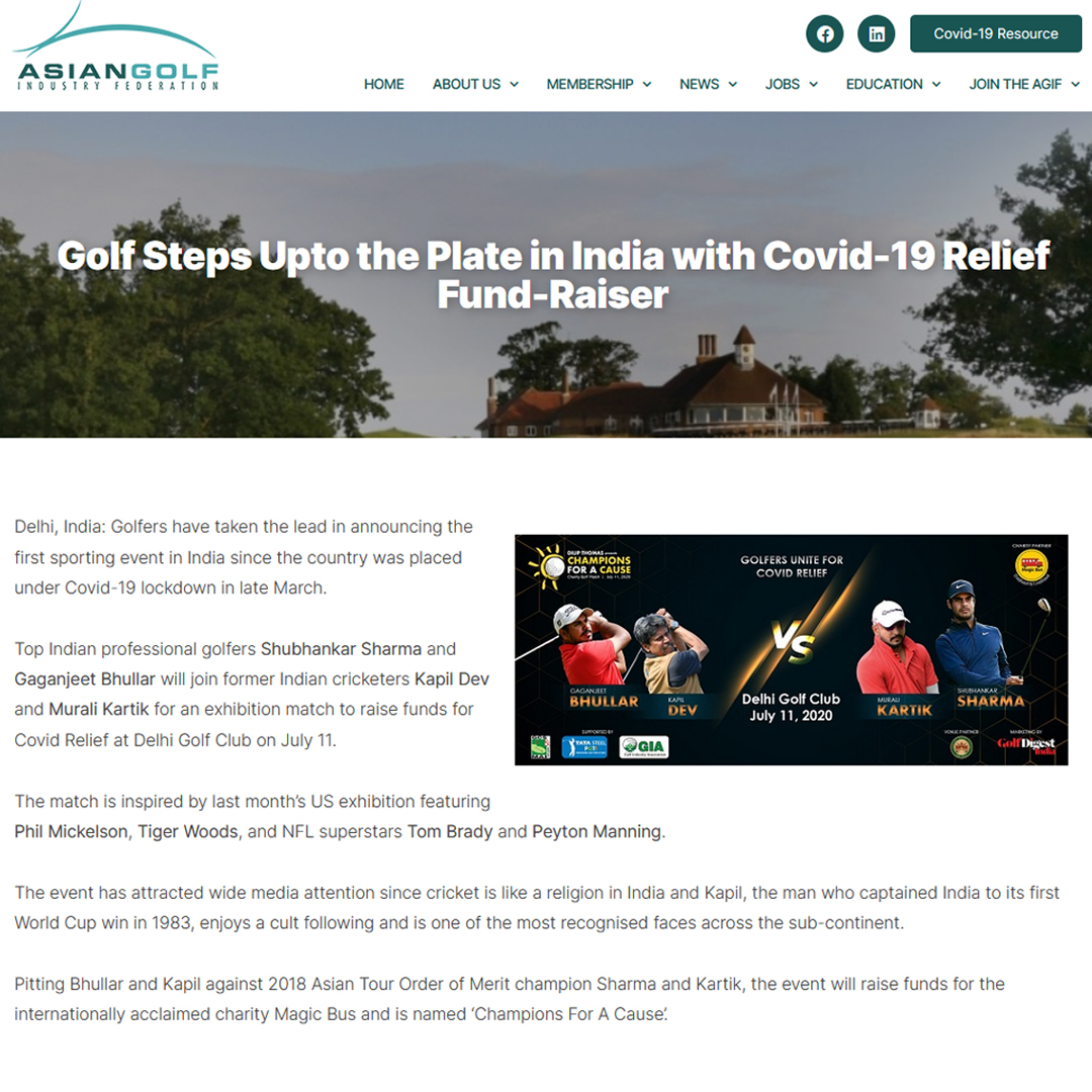 "Champions for a Cause", an 18 Hole Covid Relief Exhibition Golf Match with Kapil Dev & Gaganjeet Bhullar taking on Murali Kartik & Shubhankar Sharma at the historic Delhi Golf Club on July 11th, 2020. The FIRST Sports Community in India to come together to raise funds during this unprecedented time and the FIRST Live Sporting Event in India post the Lockdown. Champions for a cause a unique Charity Golf Event that will make a difference in the lives of children and communities by providing meals to families and children through this pandemic.